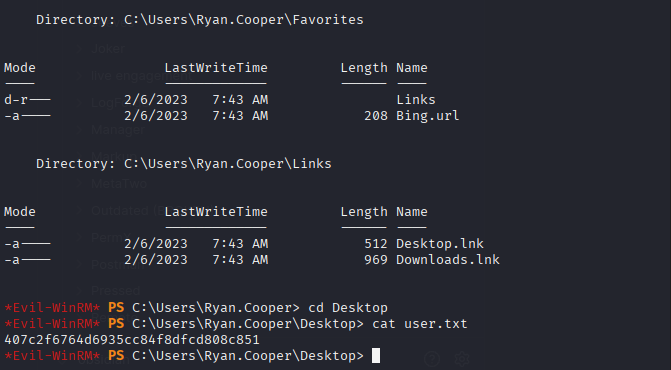 sql_svcI get WinRM access, then find plaintext creds forRyan.Cooperin SQL logs. - With