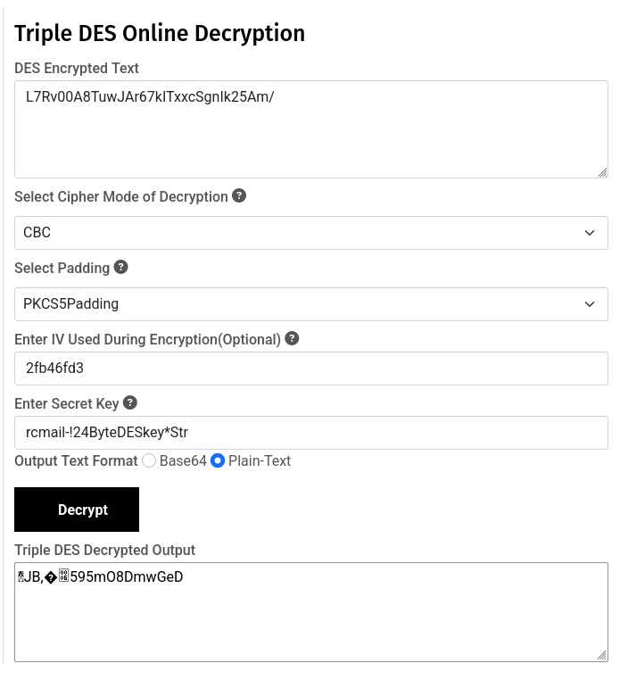 → Query thesessiontable, decode the serialized session blob forjacob, and use thedes_keyto decrypt his stored IMAP password with 3DES (DES-EDE3-CBC). - Log into Jacob’s Roundcube mailbox with the decrypted password, grab the new system password from Tyler’s email, and SSH in as
