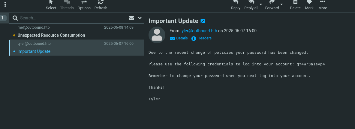 we can browse to http://mail.outbound.htb/ and log into Roundcube with Tyler’s credentials.